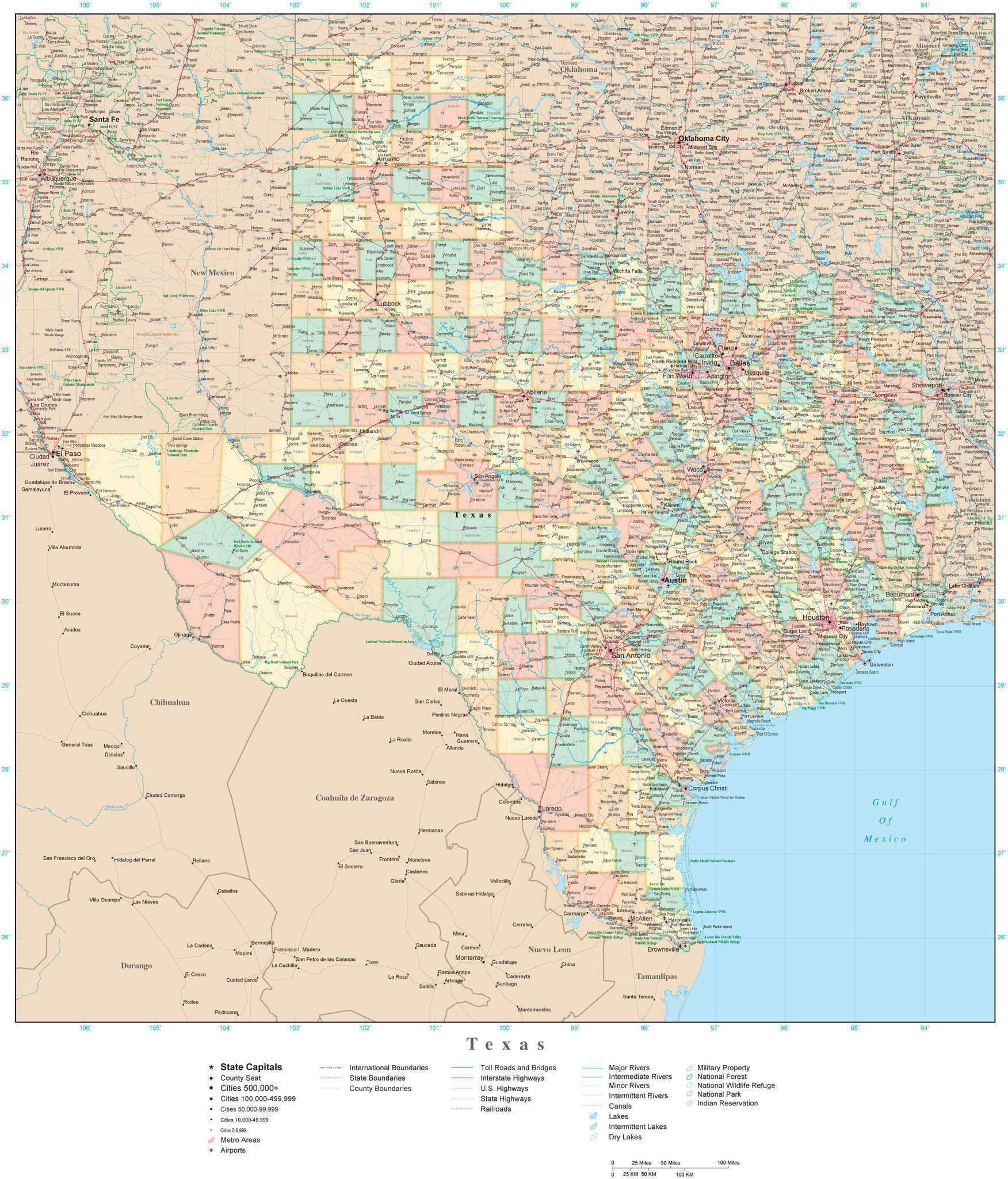 Texas State Map in Adobe Illustrator Vector Format. Detailed
